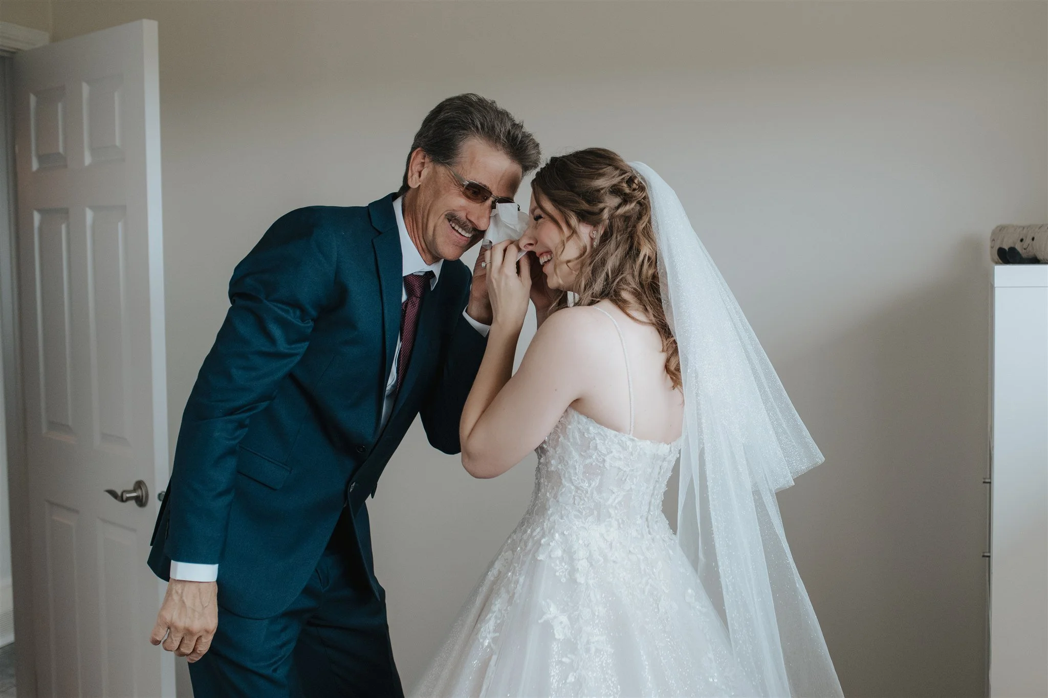 Candid sweet and funny Alberta wedding photo captured of bride and her father.